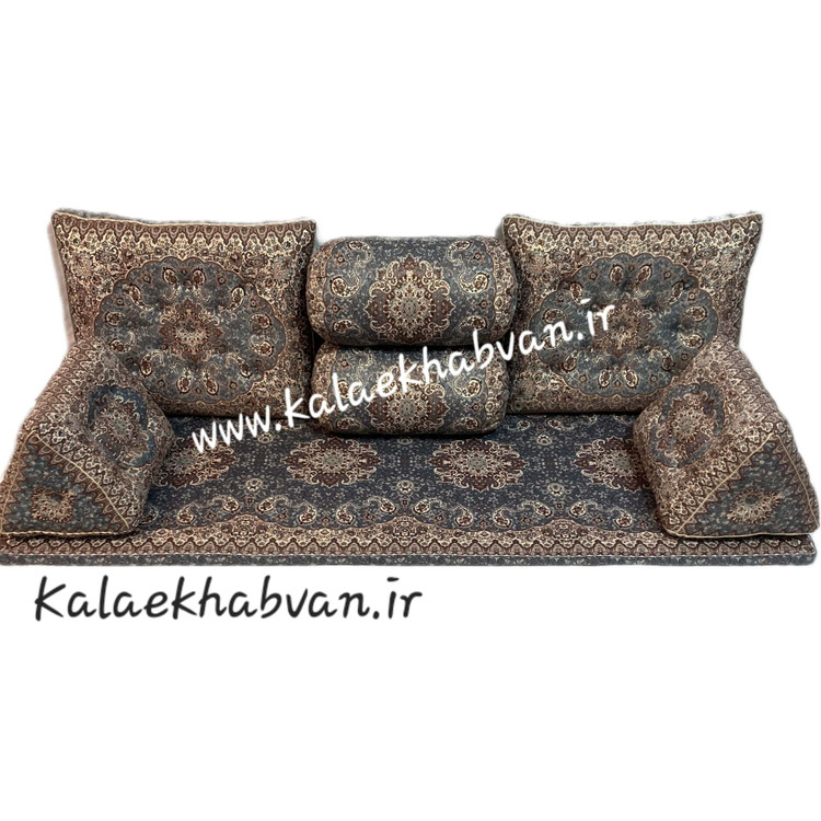 ست 7 تکه شاه نشین ترمه یزد شامل 2 عدد پشتی مثلثی، دو عدد پشتی شاه نشین، دو عدد بالش گرد و یک عدد تشک شاه نشین