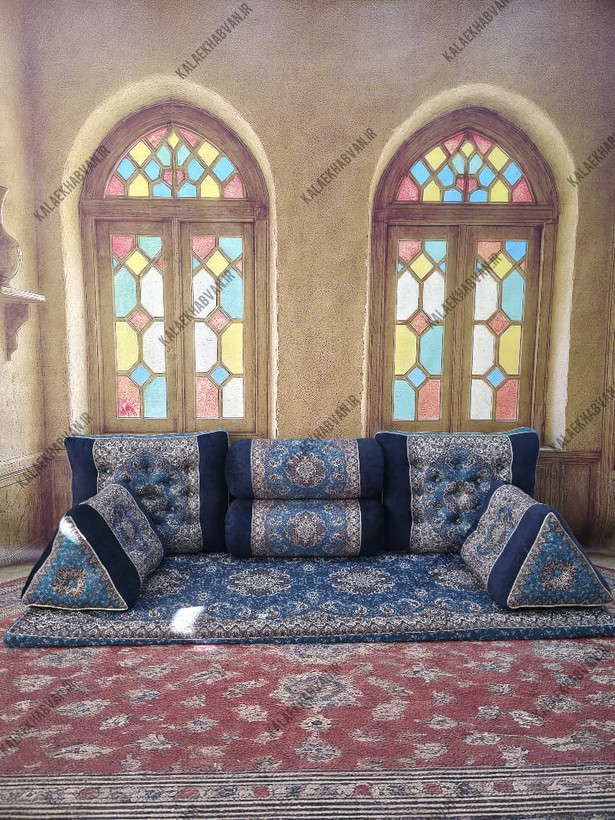 سرویس شامل 2 عدد پشتی 2 عدد بالشت گرد 2 عدد پشتی مثلثی 1 تشک